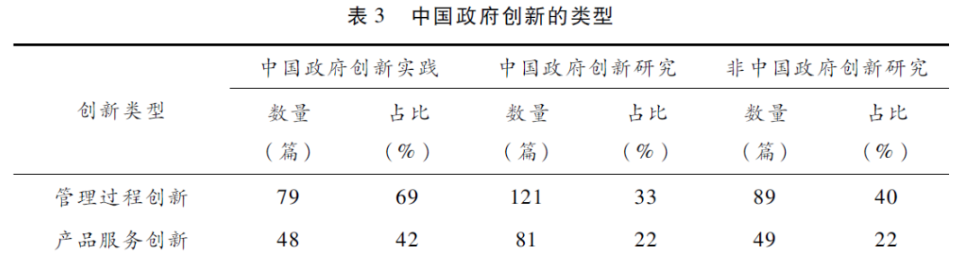 在下表3中,本文总结了现有的中国政府创新研究实证文章的研究类型。总的来看,中国和非中国政府创新的研究一样,由于受到新公共管理运动对于效率追求的影响,更加关注政府内部的组织过程创新,包括重整内部流程以提升效率的创新。针对管理过程创新的研究在所有实证研究中是最多的,占大约1/3的比例。提供顾客导向的公共服务、增强民众的满意度也是新公共管理与新公共服务运动的取向之一,产品与服务创新则代表着服务型政府取向的强化,因此亦是政府创新的重要内容,相关研究占大约1/5的比例。