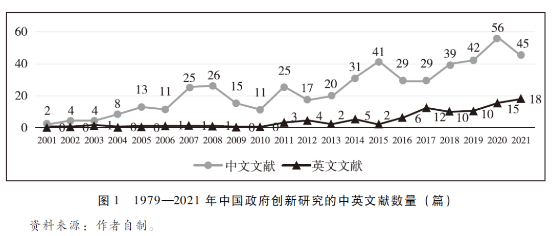 如图1所示,中国政府创新学术文献的出现始于2001年,并在2014年进入了快速增长期。中文文献最早见于厦门大学黄永炎在《理论与改革》上发表的《地方政府创新行为的制度分析》(黄永炎, 2001)和山西省委党校王瑞娟在《理论探讨》上发表的《论政策创新》(王瑞娟, 2001);前者以中国的经济制度改革为例对话了经济学上的制度变迁理论,后者则是经验总结式文章。英文文献最早见于哈佛大学肯尼迪政府学院东亚研究中心主任塞奇(Tony Saich)和中央编译局比较政治与经济研究中心研究员杨雪冬在Pacific Affairs上发表的以基层自治选举改革为分析对象的案例研究(Saich & Yang, 2003),其对话的是政治发展理论。可见,在研究初期,中英文世界关于中国政府创新的研究在研究取向和路径上并不相同。长期以来,中文学刊一直是中国政府创新研究的发表阵地,但自2017年始,中国研究[2]学者利用丰富的经验材料,将中国政府创新研究发表到英文学刊上,连续4年保持10篇以上的发文量,在2021年更是多达18篇。