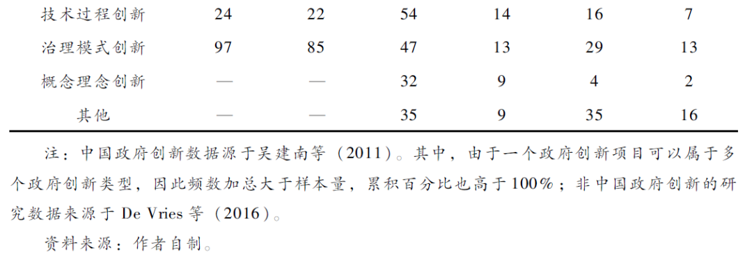 从表3可以看出,中国研究和非中国研究的最大差别呈现在对技术过程创新的关注方面。中国近年来在政府行动或公共服务中积极引入新的数字治理技术,例如开通微博、微信公众号、云直播等,其实践在各类政府创新中的占比较高。丰富的实践开拓了技术过程创新的研究空间,导致这一关注在中国研究文献中的占比高达14%,远高于非中国研究文献的7%。此外,就概念理念创新而言,中国研究文献的关注也较高,智慧城市创新是其中最重要的研究对象。其实,在很大程度上,智慧城市创新属于技术过程创新的范畴,由此可见,技术过程创新在中国政府创新实践和研究中都占据重要地位。