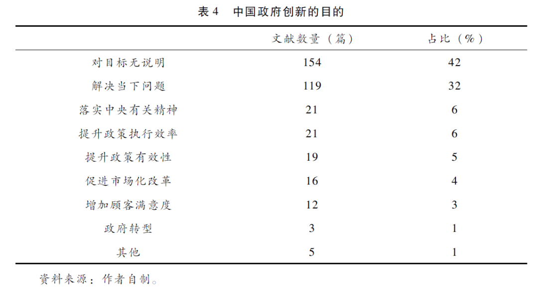 政府创新的目的是引领政策创新,考察目的是关注并分析结果的基础。在现有的文献中,近四成没有对政府创新的初始目标进行说明,这可能是由于既有研究大多关注政策过程而非创新本身,也可能是政府创新过程“黑箱”没有完全被打开,了解政策创新的目的存在一定困难。在那些对创新目的有所说明的文献中,解决当下工作中出现的问题是最主要的目的,32%的实证文献中提到了这一点,例如解决农村贷款难的问题、环境污染问题、稳定劳动关系、解决城市居民出行难题等。这一点体现了我国政府创新中的实用主义或现实主义导向(见表4)。