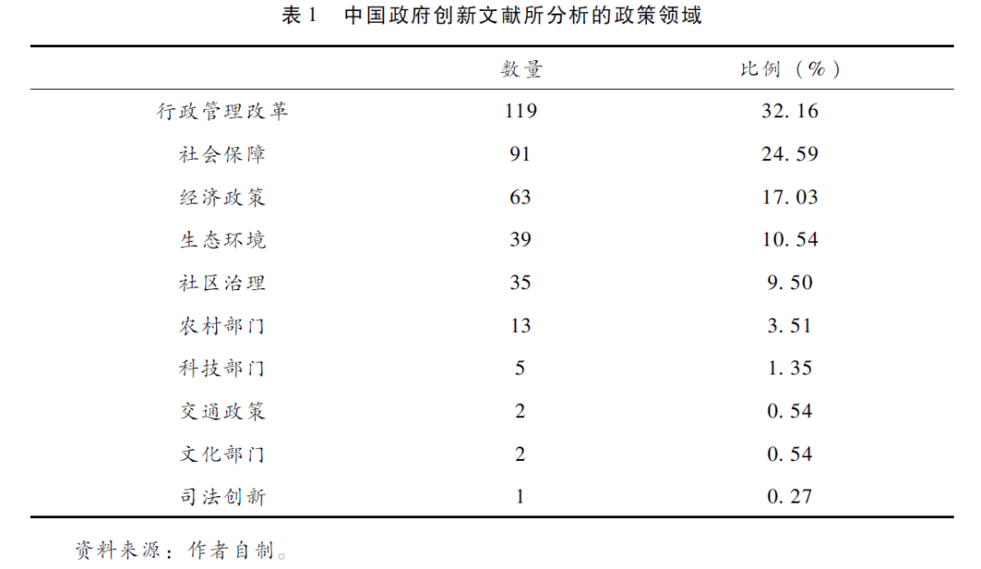 在实证分析的文献当中,一个显著的关注点是政府创新发生的层级与新政策所在的领域。就层级而言,地方政府成为关注重点(占文献总量的65.4%);其中,市级政府最受关注,而县级及县级以下政府(在中国语境中通称“基层政府”)尽管在实践中是政府创新所集中的层级,占比一度高达54.4%(吴建南等,2011),但研究文献的占比仅为17.6%。由此可见,对于基层政府创新发生机制与发展情况的研究仍需强化。