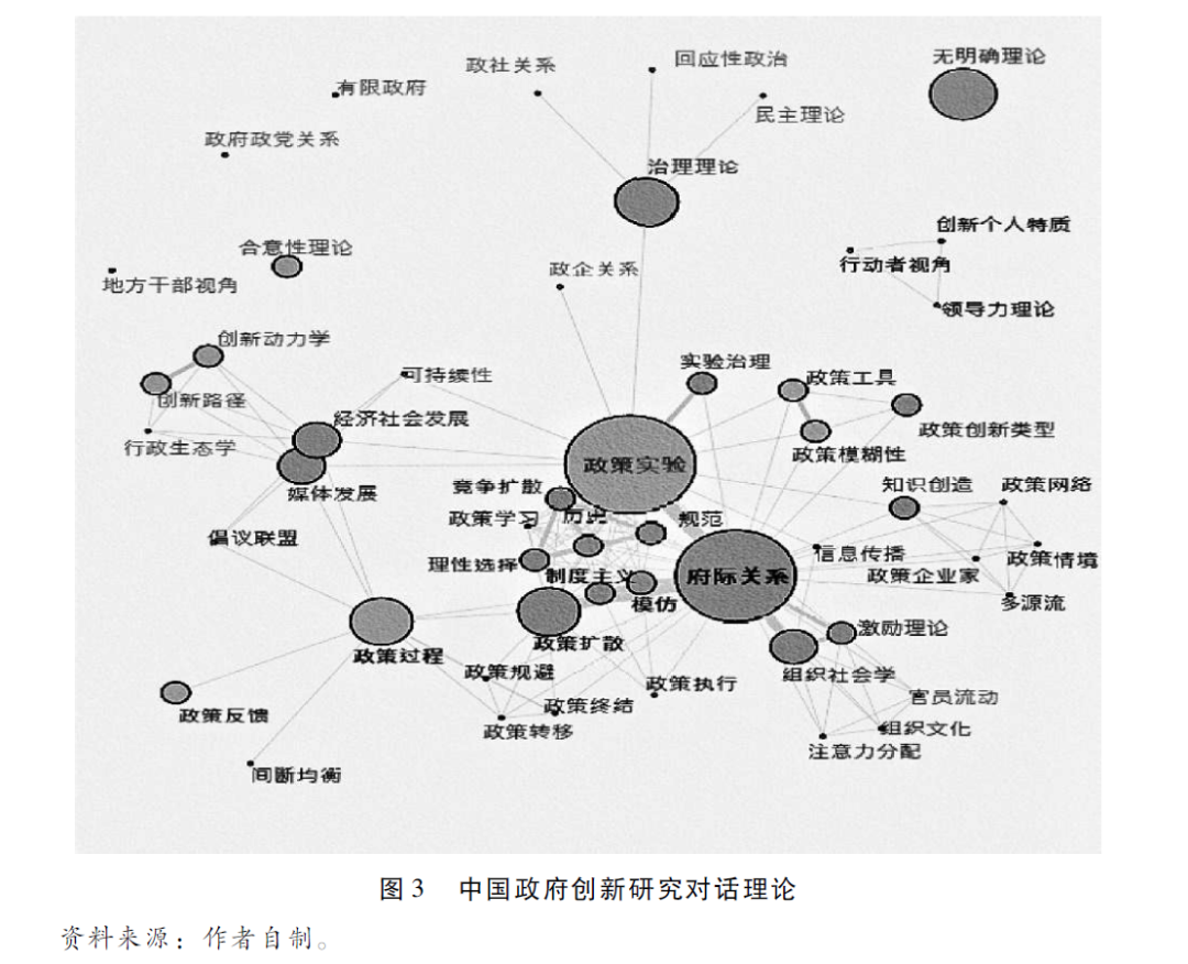 须注意的是,图3左侧是针对中国政府创新发展出来的一些有特色的理论视角。除了政策试验和创新可持续性的视角被相关文献所采纳外,其他一些视角则游离在文献网络的边缘。许多总结中国特色实践而发展出的视角,包括创新路径学、创新动力学、合意性理论、地方干部视角、行政生态学等,处在零散探索的阶段,而且这些视角所关注的因素亦没有超出西方政策创新与扩散研究范式中的因素。因此,中国政府创新研究如何通过挖掘细化的、具有中国色彩的理论要素,并与非中国政府创新研究的理论发展对话,依然是未来相关学术发展的重中之重。
